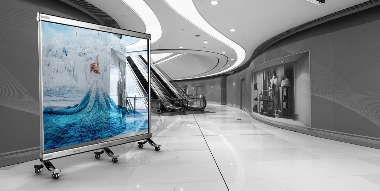 La pantalla transparente permite ver contenido digital sin bloquear la vista al fondo, combinando publicidad y diseño arquitectónico. Integra alta definición con transparencia visual.