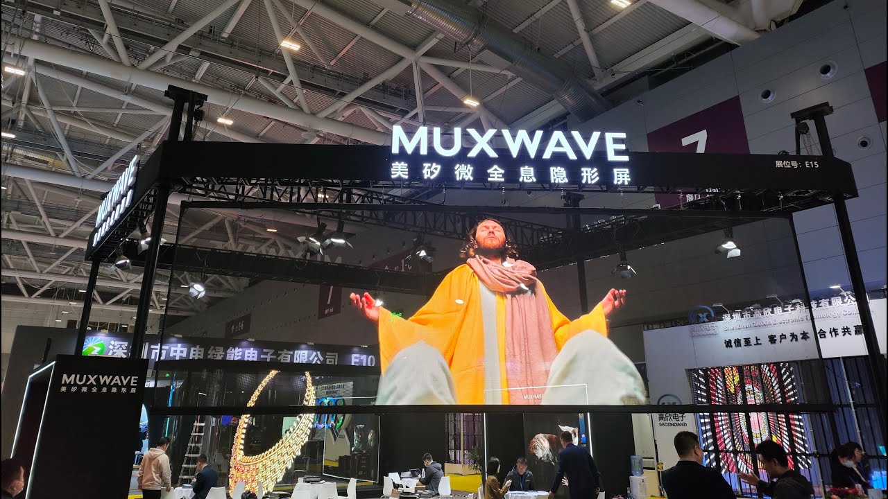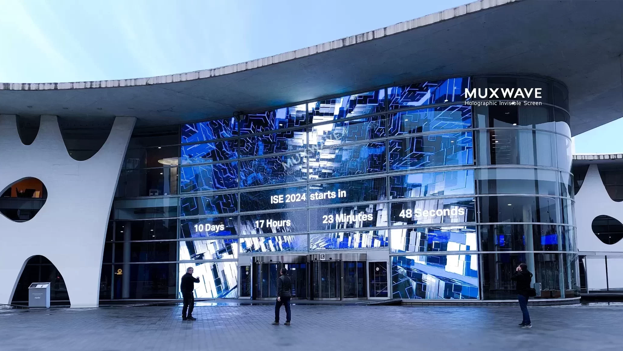 La pantalla transparente permite ver contenido digital sin bloquear la vista al fondo, combinando publicidad y diseño arquitectónico. Integra alta definición con transparencia visual.